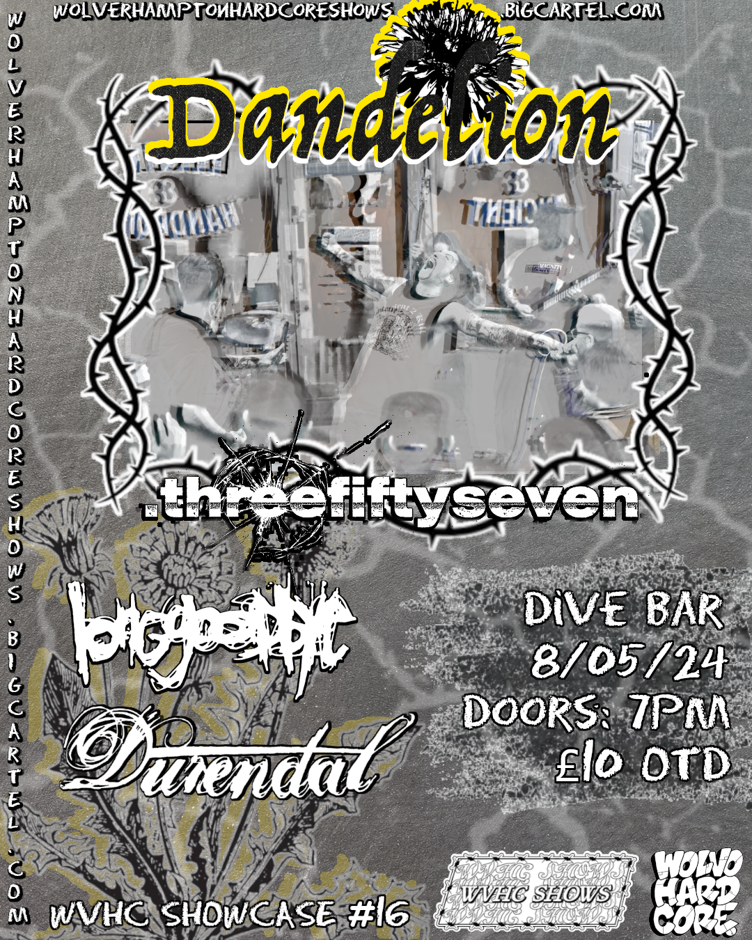 Back to All Events WVHC SHOWCASE #16 Wednesday 8 May 2024 19:00 23:00 Dive Bar Exchange St WV1 1TS (map) Google Calendar ICS WOLVERHAMPTON HARDCORE PRESENTS WVHC SHOWCASE #16DANDELION.THREEFIFTYSEVENLONG GOODBYE DURENDAL£10 ON THE DOORADVANCE TICKETS: WVHC BIGCARTEL